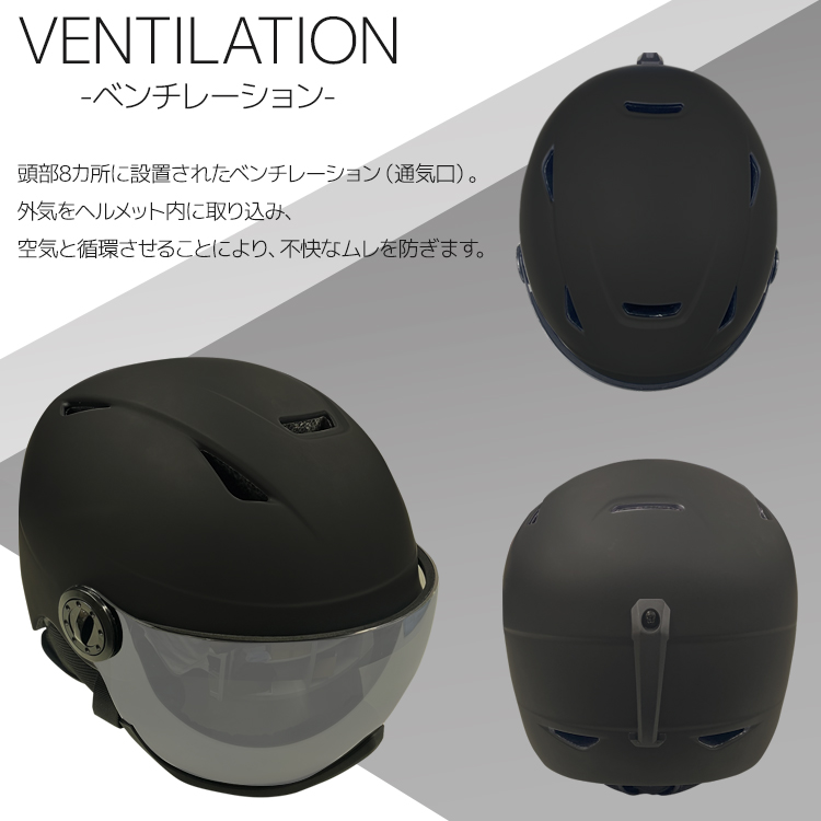 ヘルメットとゴーグル機能が一体となったモデル。眩しさを軽減するだけでなく、有害な紫外線を99%以上カットし目を守ります。バイザーを使用しない時は、上にスライドできます。