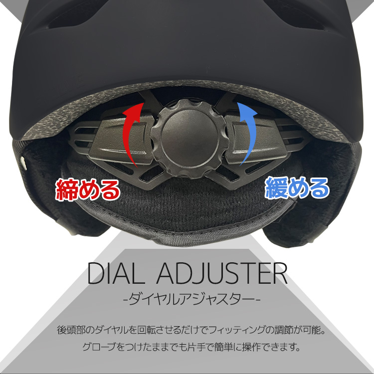 後頭部のダイアルを回転させるだけでフィッティング調節が可能。グローブをつけたままでも片手で簡単に操作できます。
